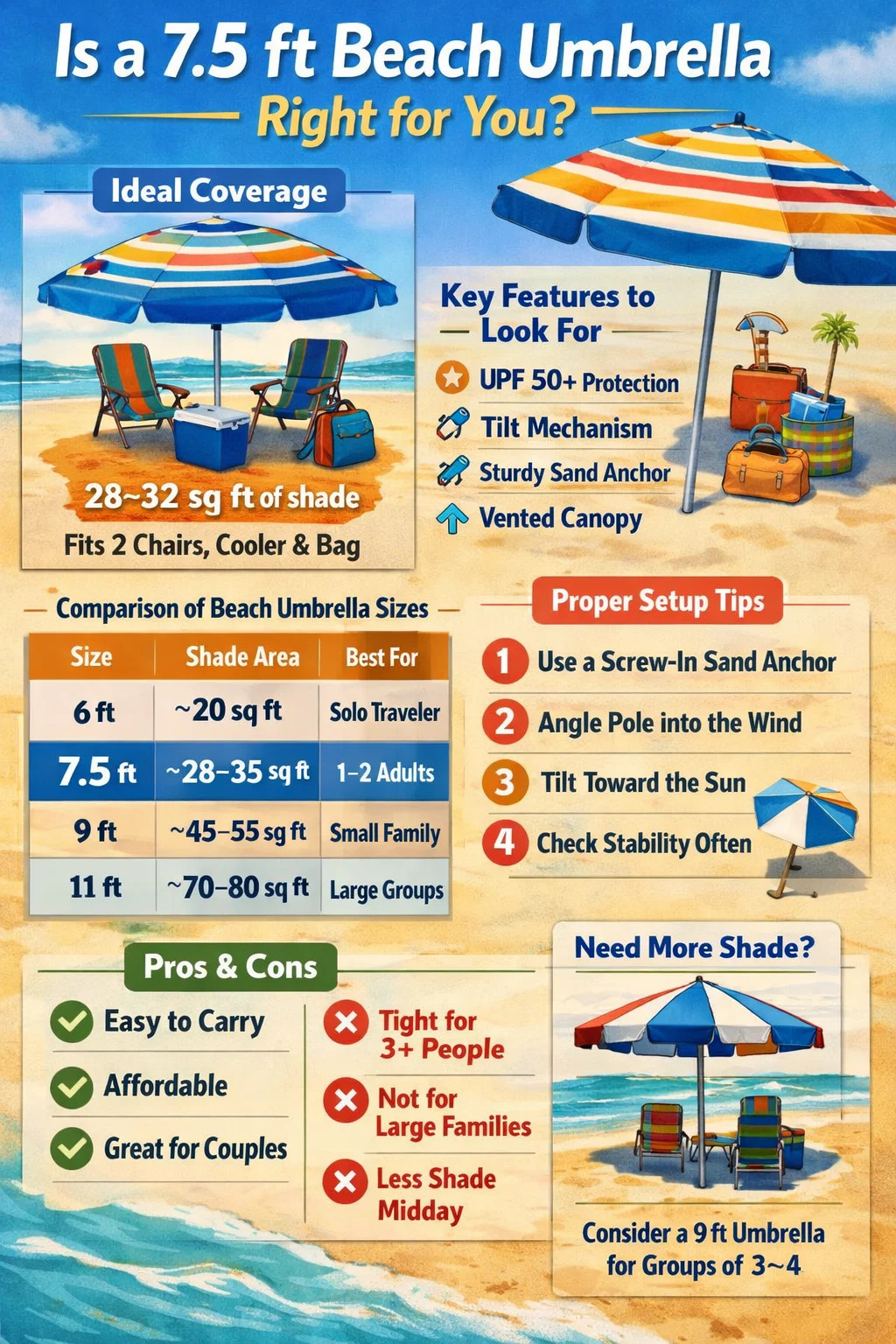 A rövid válasz: a 7,5 láb hosszú napernyő jó okkal a legnépszerűbb méret a piacon - nagyjából 28-32 négyzetméter árnyékolt területet fed le, ami elegendő két strandszéknek, egy hűtőnek és egy táskának anélkül, hogy bárki ülne közvetlen napfényben. Ha egyedül vagy párnak vásárol, a 7,5 láb magas lombkorona tökéletes helyet foglal el a hordozhatóság és a praktikus lefedettség között. Három vagy több fős csoportok esetén érdemes 9 láb-os lehetőségeket választani, de a legtöbb tengerparti kiránduláshoz 7,5 láb a megfelelő.