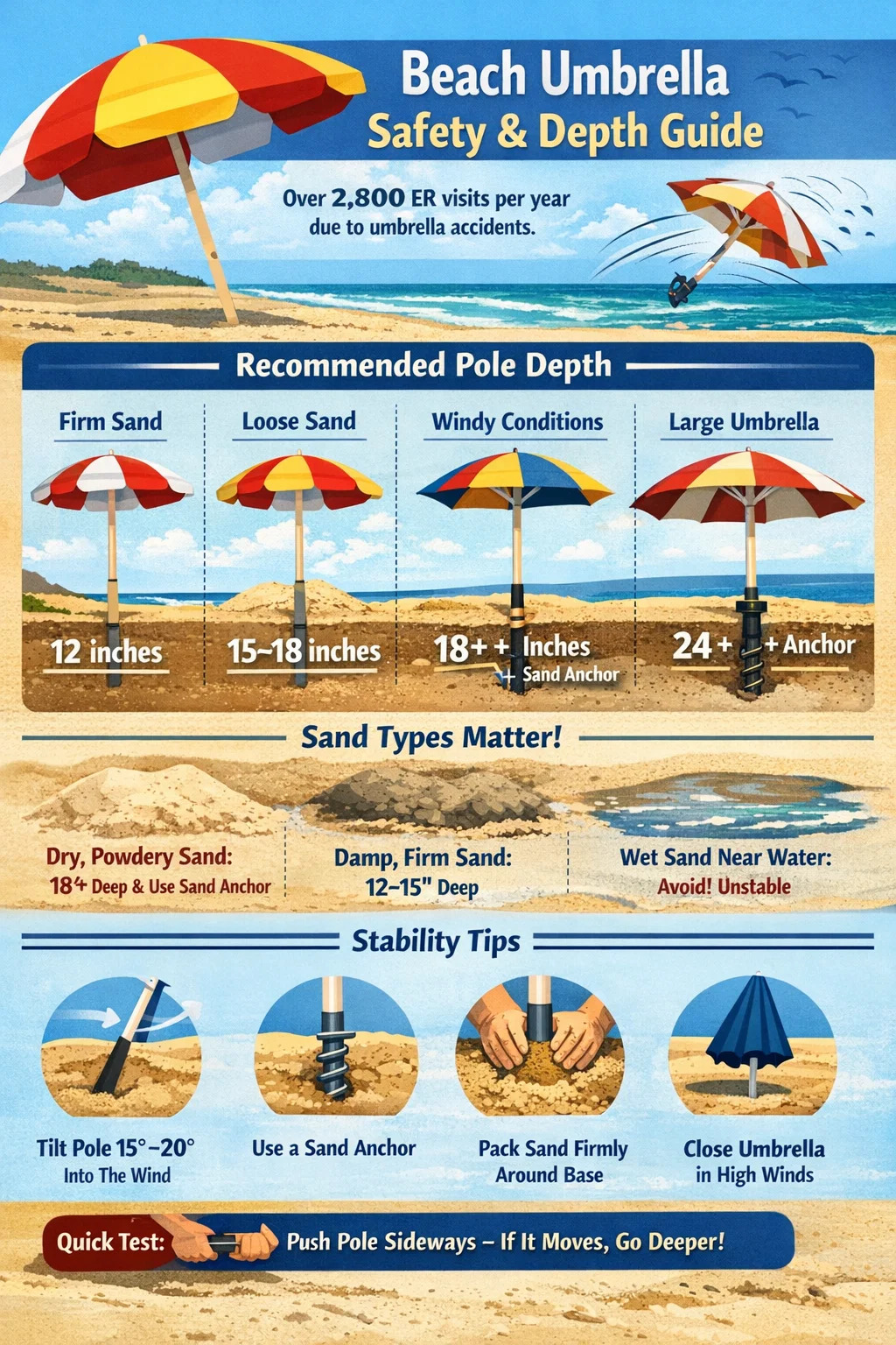 A széles körben ajánlott 12 hüvelykes minimum átlagos strandviszonyok esetén érvényes: közepesen tömör homok, enyhe vagy enyhe szellő (10 mph alatt) és szabványos 6–7,5 láb hosszú napernyő. Valós körülmények között gyakran mélyebbre kell mennie.