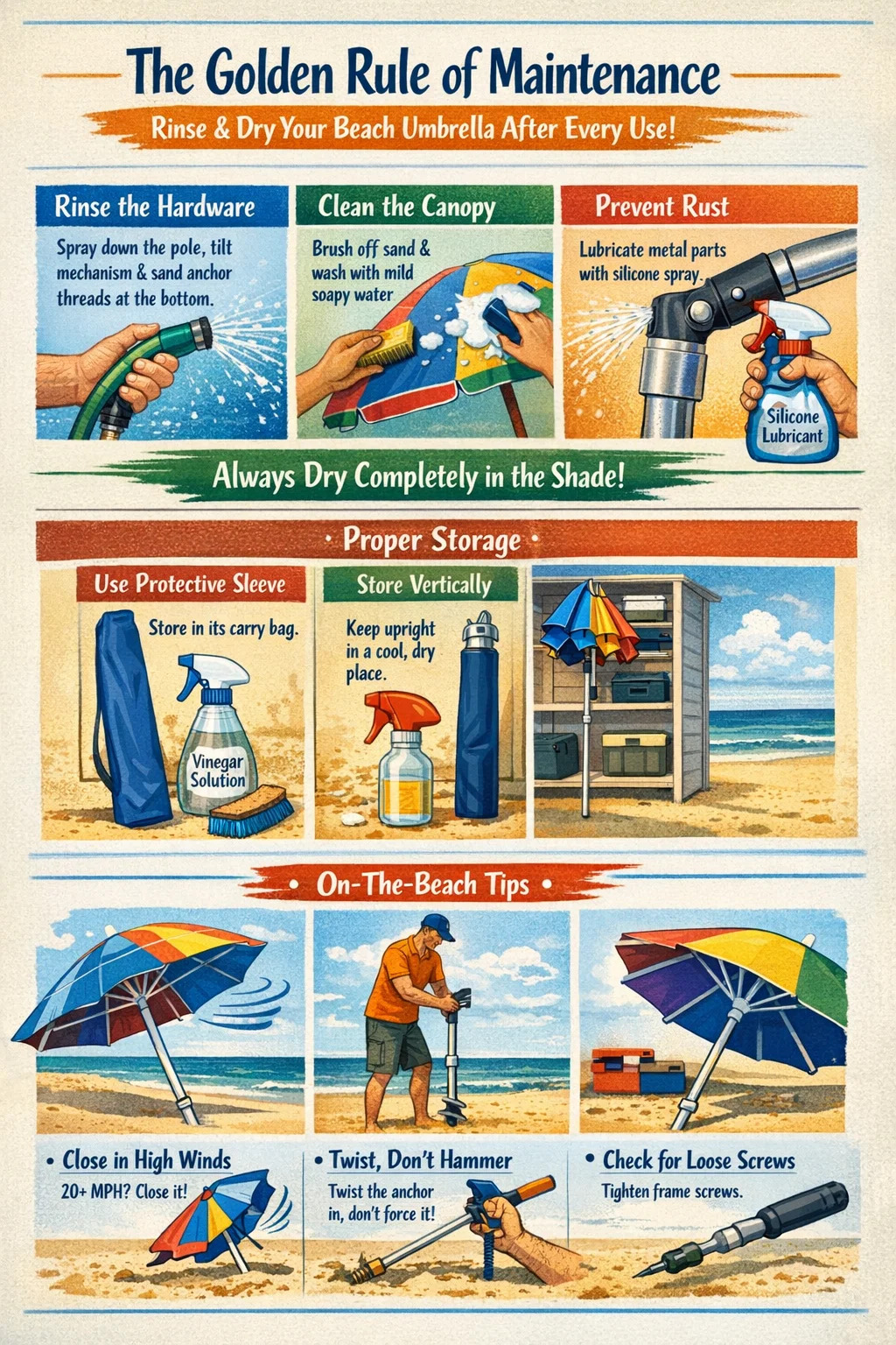 A karbantartás legkritikusabb lépése a napernyő az, hogy öblítse le friss vízzel és szárítsa meg teljesen minden egyes használat után. A sós víz és a homok maró hatású, és rontja a szövet és a rozsdás fémkötéseket. Ha öt percet tölt a felszerelés öblítésével, élettartamát egyetlen szezonról a végéig meghosszabbíthatja öt év megbízható használat .