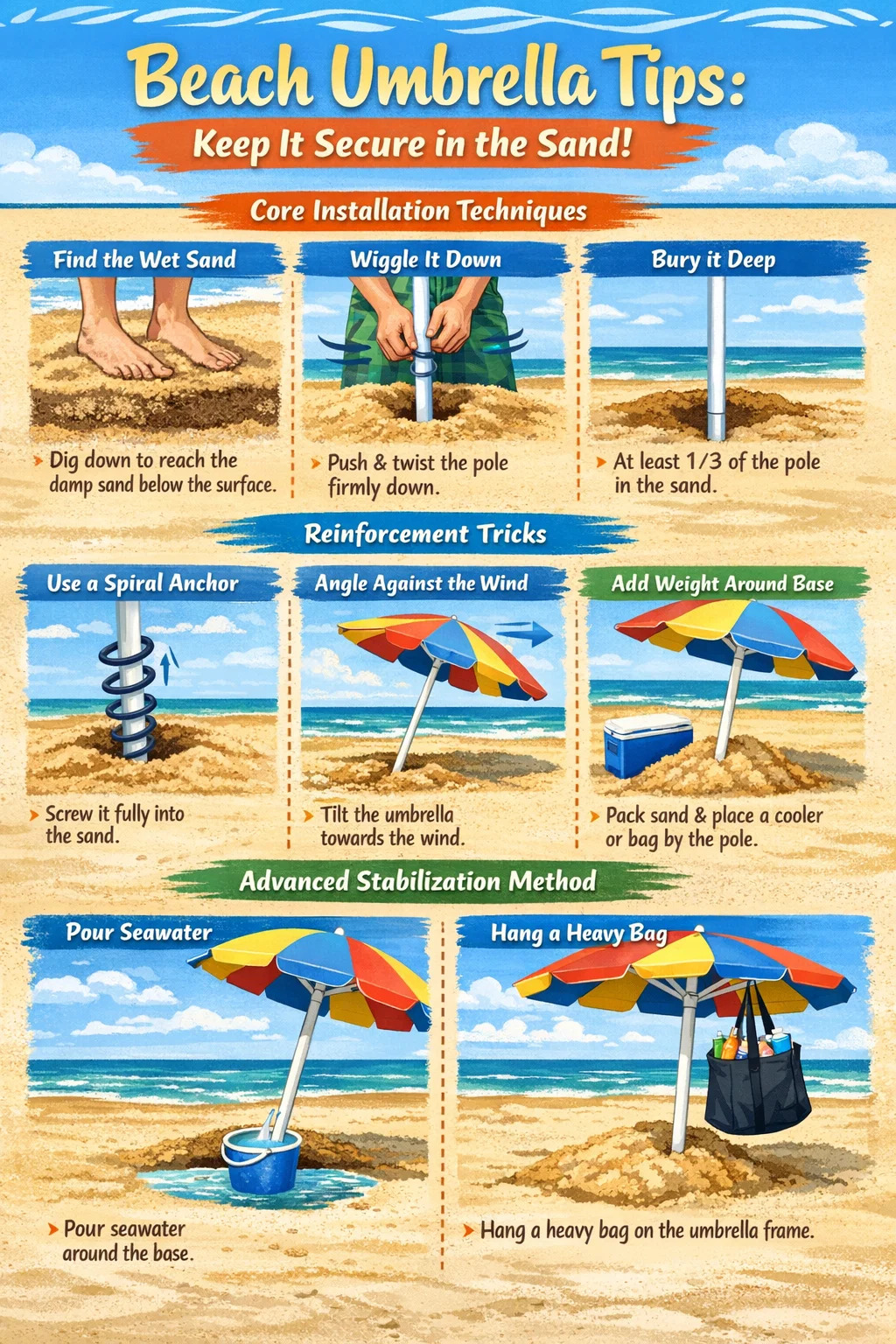 There's a trick to keeping your beach umbrella firmly planted in the sand, preventing it from being blown over by the sea breeze. Many people simply stick it in the sand haphazardly, and the umbrella flies away with the first gust of wind.
