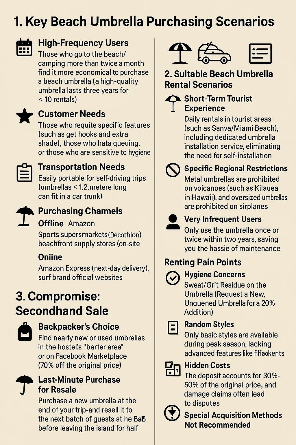 Megszerezni a tengerparti esernyő Rugalmasságot igényel a felhasználás gyakorisága, az utazási természet és a költségvetés alapján. A következők egy empirikus elemzés: