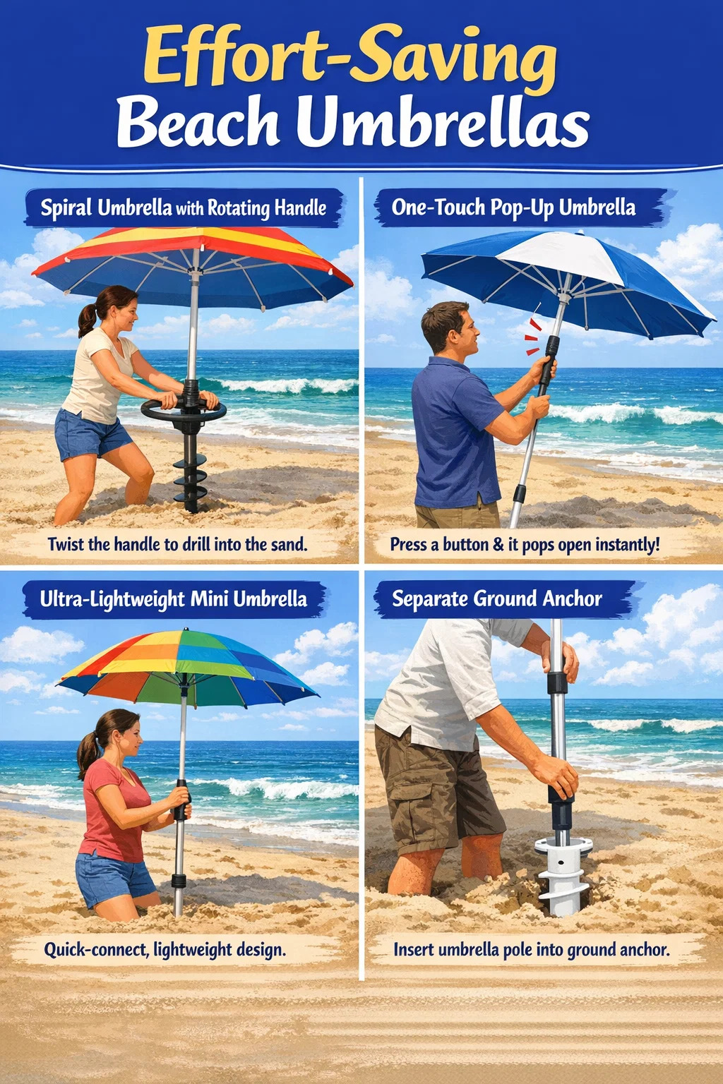 Működése: Ahelyett, hogy nyers erőt használna a lenyomáshoz, két kézzel forgatja előre-hátra a fogantyút, mintha a bicikli kormányát fogná, és az esernyő alján található spirálfúró könnyen belevág a homokba.