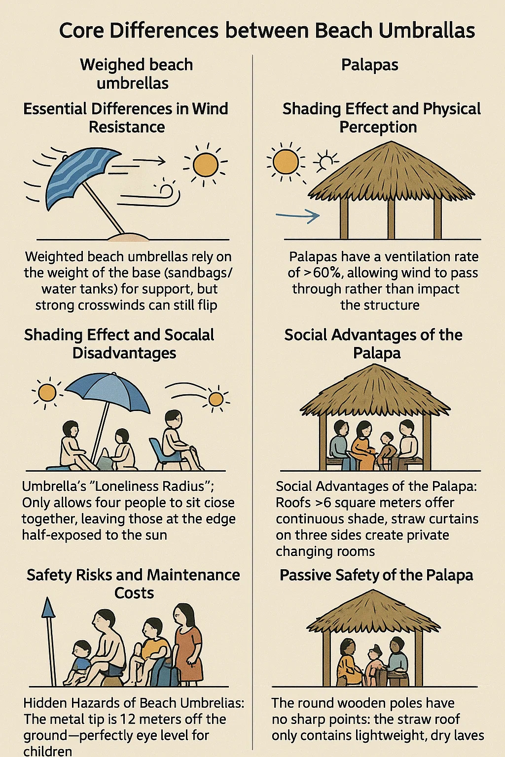 A tengerparti esernyő napvédő korlátozások: Az esernyő alatti árnyék a nap szögével elmozdul, gyakori beállításokat igényel. Az ezüst bevonat nem hatékonyan tükrözi a talajból származó hő sugárzást, tehát még délben, amikor a homokfelület 60 ° C, az esernyő alatti hőmérséklet továbbra is meghaladhatja a 40 ° C -ot. A palapák természetes hűtést kínálnak: a megvastagodott tenyérfrontok inkább a hőt abszorbeálják, nem tükrözik azt, fenntartva az állandó páratartalmat (a tengerparton mérve, 3-5 ° C-os alacsonyabb, mint az esernyő alatt); A teljes napfényben nem kell beállítani.